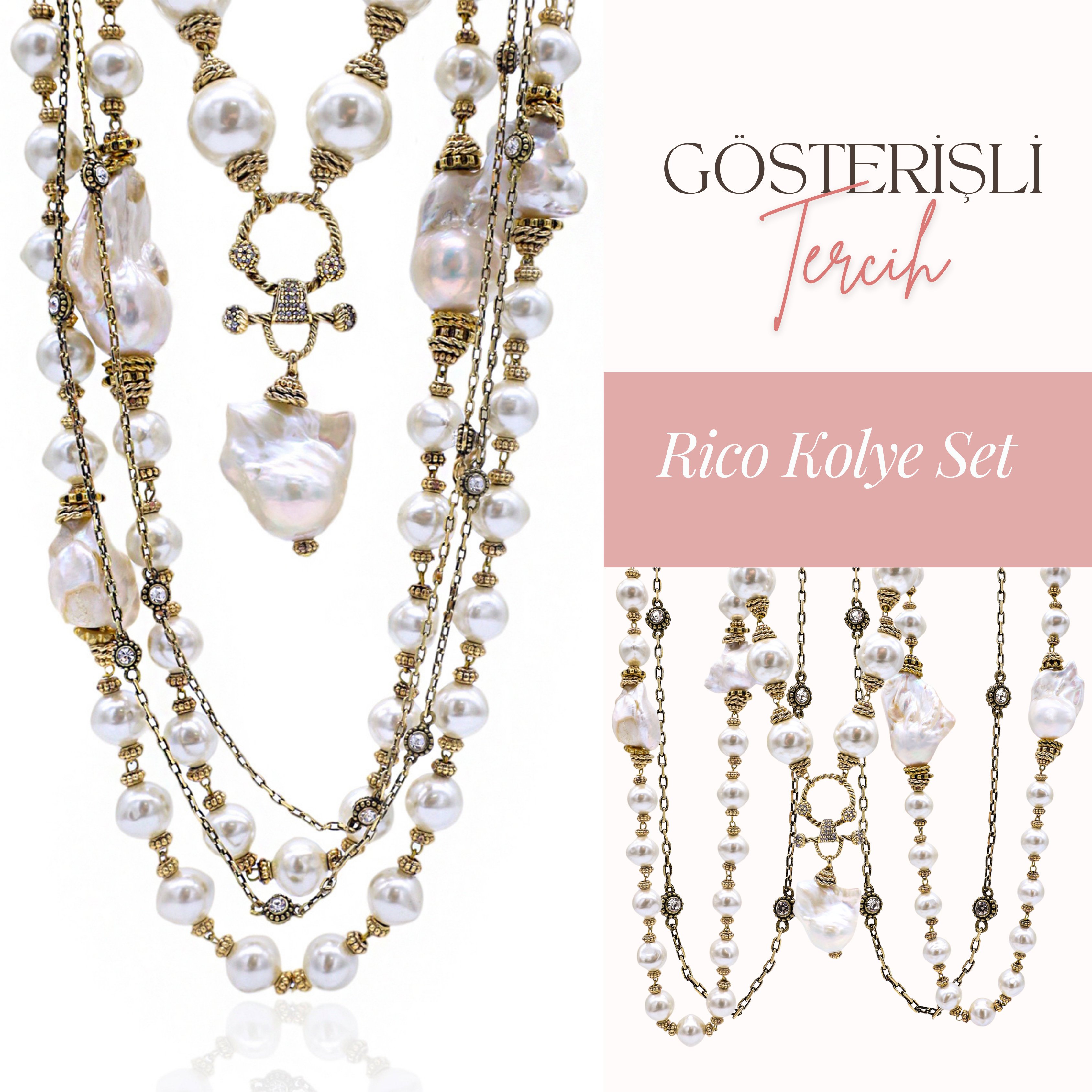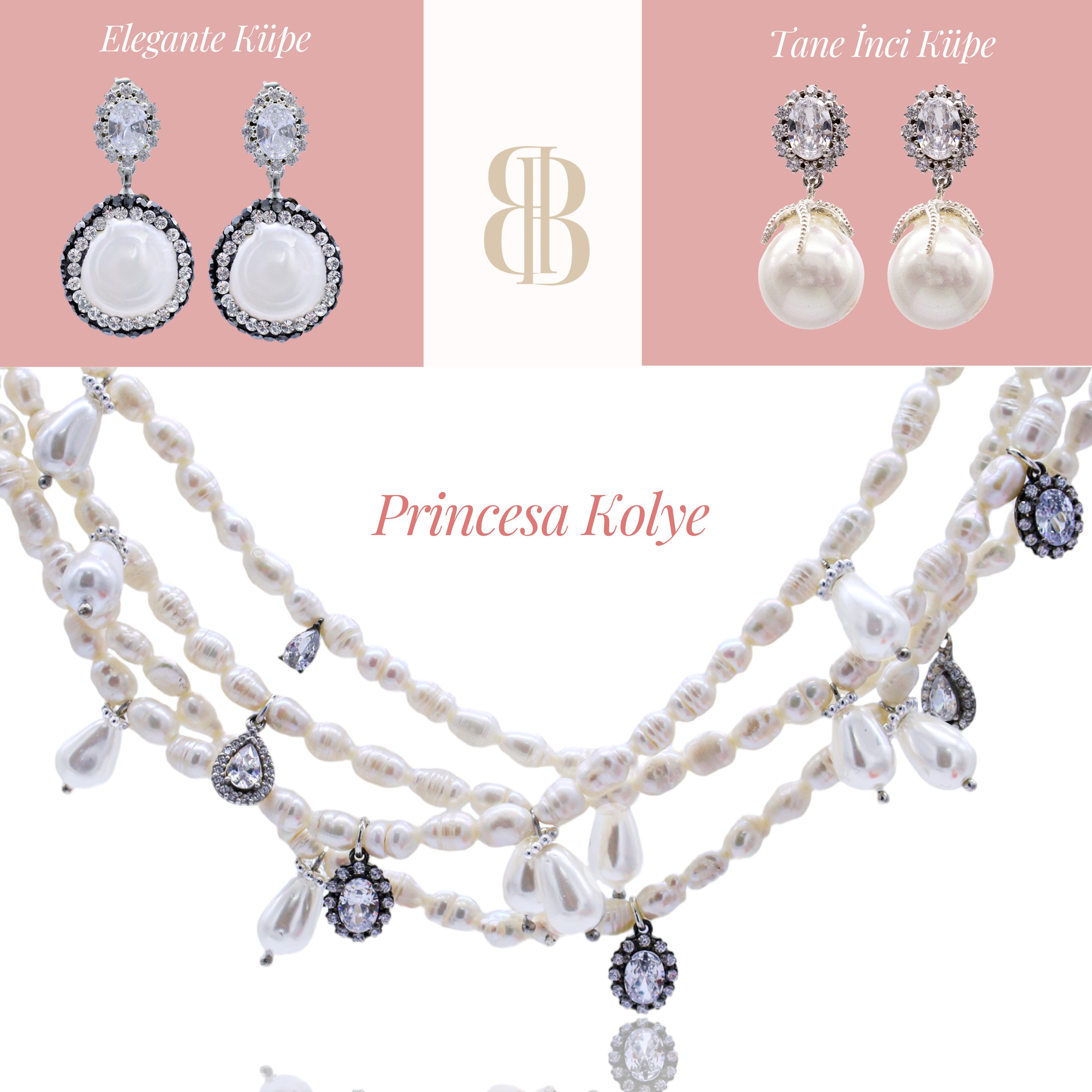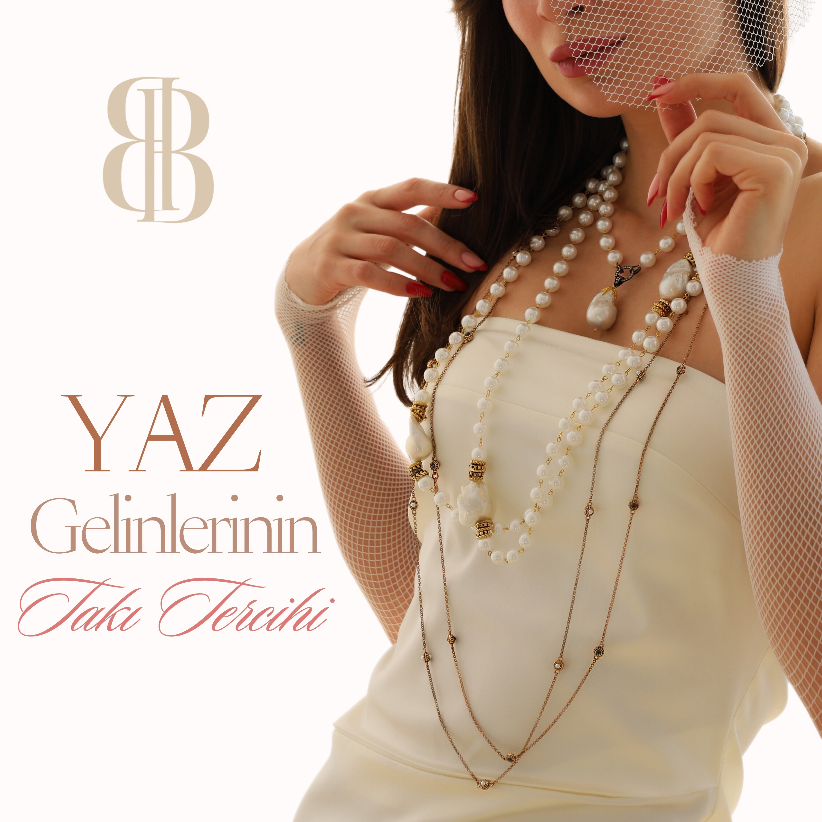 Gelinlik seçiminiz sade ve hareketsiz ise en özel gününüzü tamamlayacak takı tasarımları kesinlikle Bayemeyc çoklu inci tasarımlarıdır.